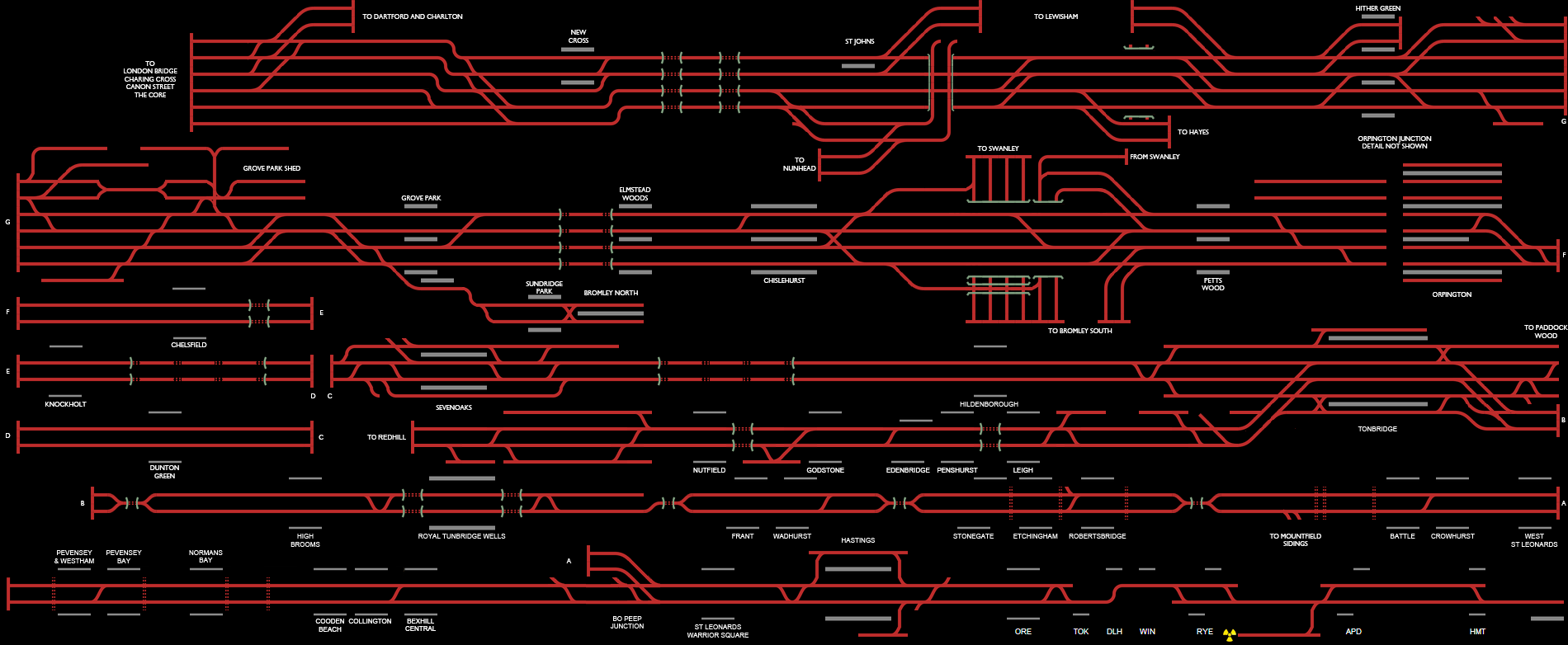 KEY: Level Crossings: U=UP, D=DOWN (blank neither), C=CROSSING CLEAR, $ $ Red Road Lights, F=FAILED, L=LOCAL CONTROL ACTIVE. Points: (=NORMAL, )=REVERSE. Routes: *=ROUTE SET. Other: )=RELEASE