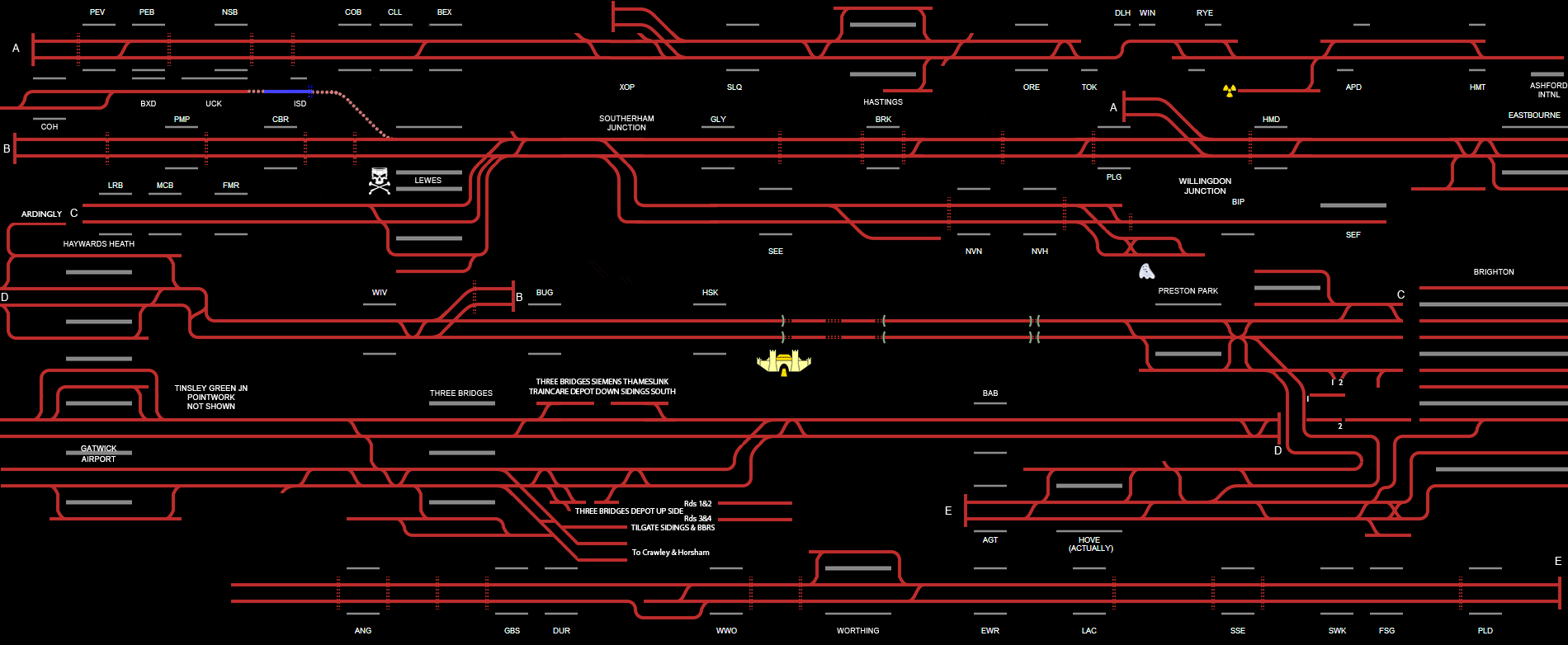 KEY: Level Crossings: U=UP, D=DOWN (blank neither), C=CROSSING CLEAR, $ $ Red Road Lights, F=FAILED, L=LOCAL CONTROL ACTIVE. Points: (=NORMAL, )=REVERSE. Routes: *=ROUTE SET. Other: )=RELEASE
